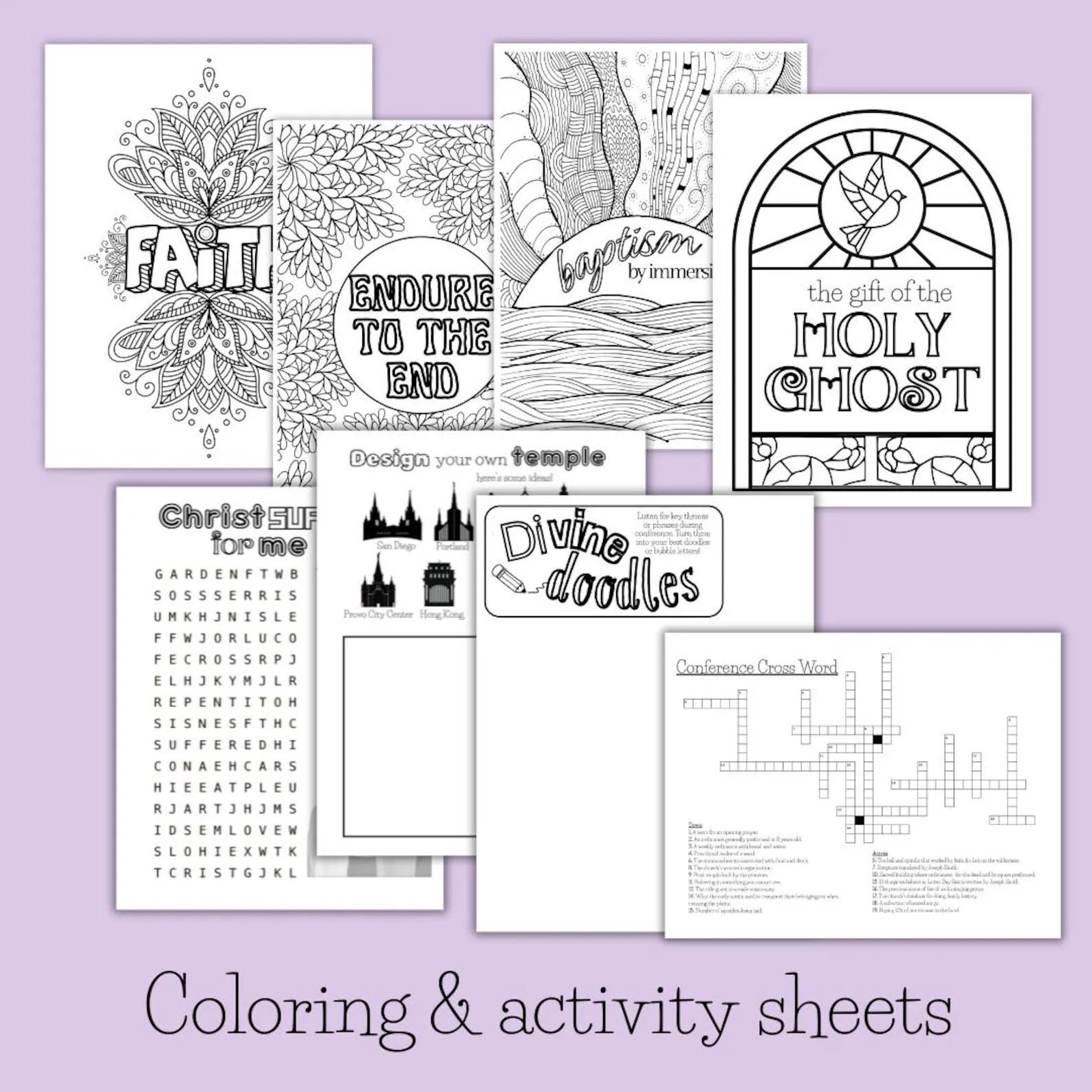 This General Confernece DIGITAL DOWNLOAD PDF packet will be a hit with your teens! Perfect for using in The Church of Jesus Christ of Latter-day Saints General conference, or giving out from Young Women’s/Young Men’s. This packet includes 20 pages of adult-style coloring pages, speaker note sections, goal planning worksheets, a word search and crossword puzzle, and a “divine doodle” page!